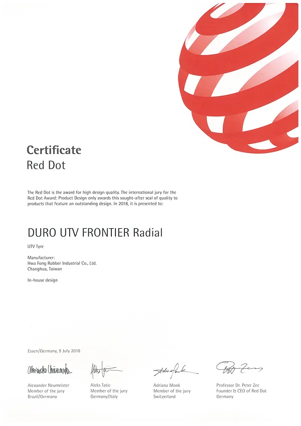 DURO華豐輪胎各項產品暢銷全世界,榮獲德國紅點設計大賞及台灣精品獎的「傑出」表現,贏得海內外客戶的一致好評。